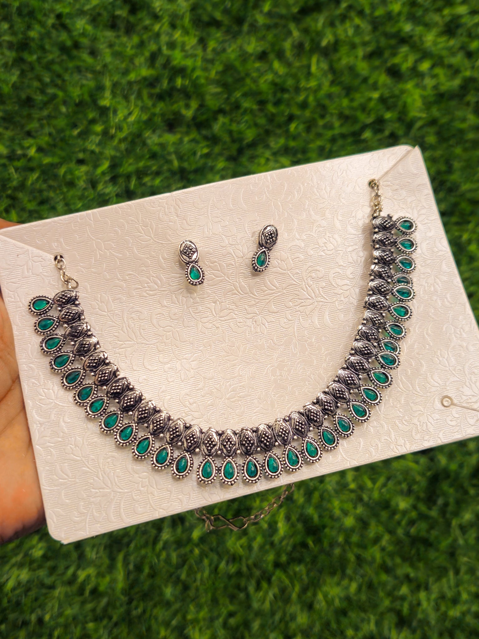 This chic oxidized necklace 🌿 brings a blend of vintage charm and modern style. Its intricate detailing and bold design make it a standout accessory for ethnic and casual looks alike 🎨. Lightweight yet striking, this piece adds a statement to your outfit without overwhelming it 💫. Perfect for those who love a touch of tradition with a contemporary twist 🌺.